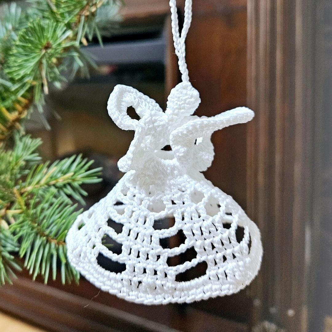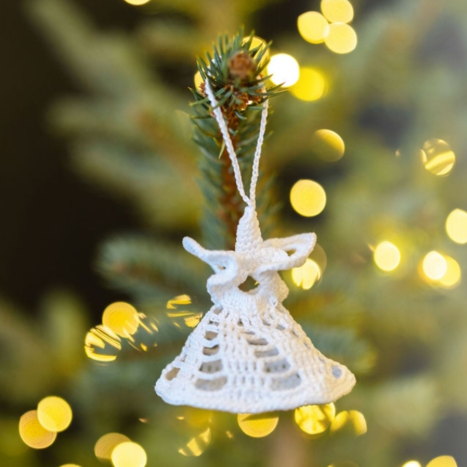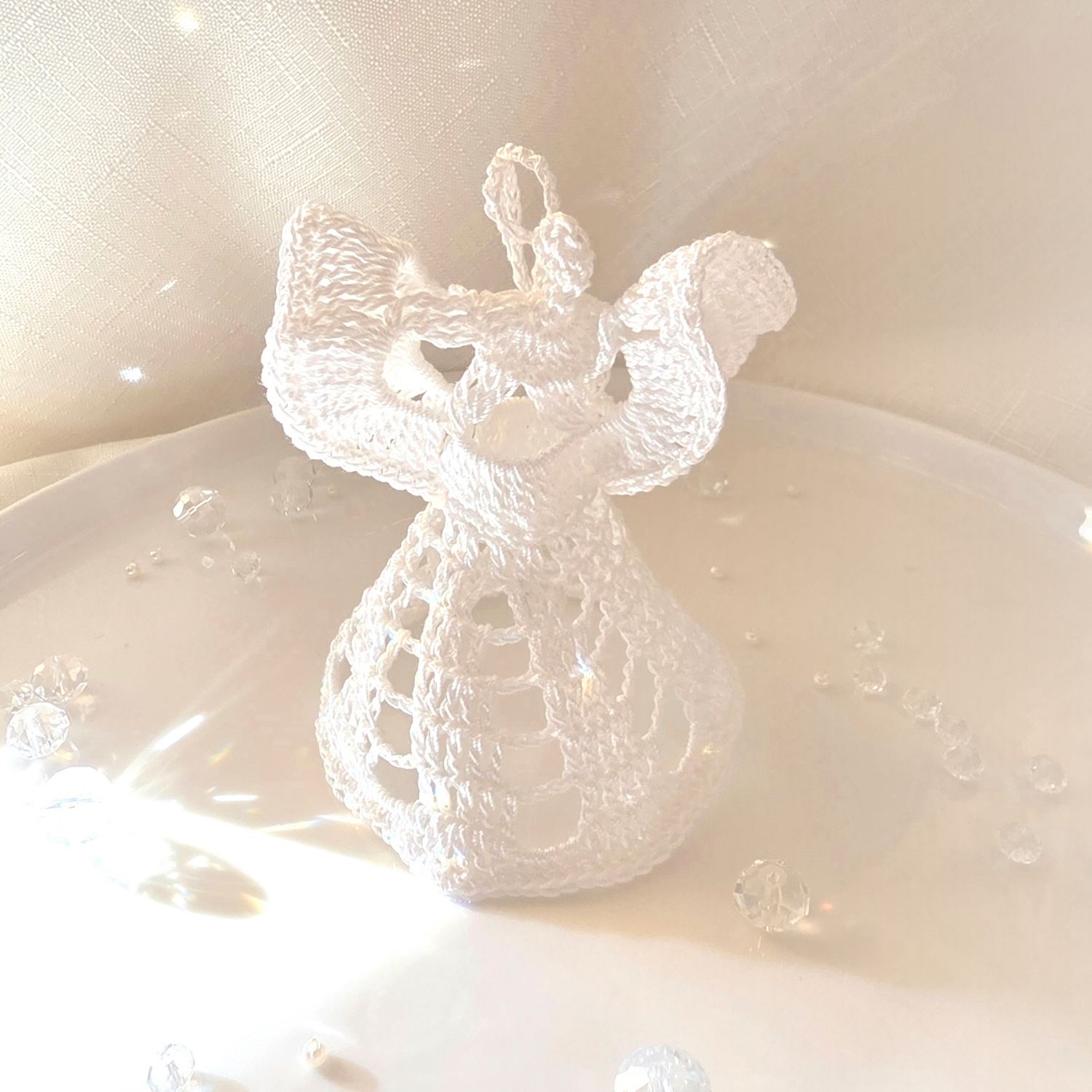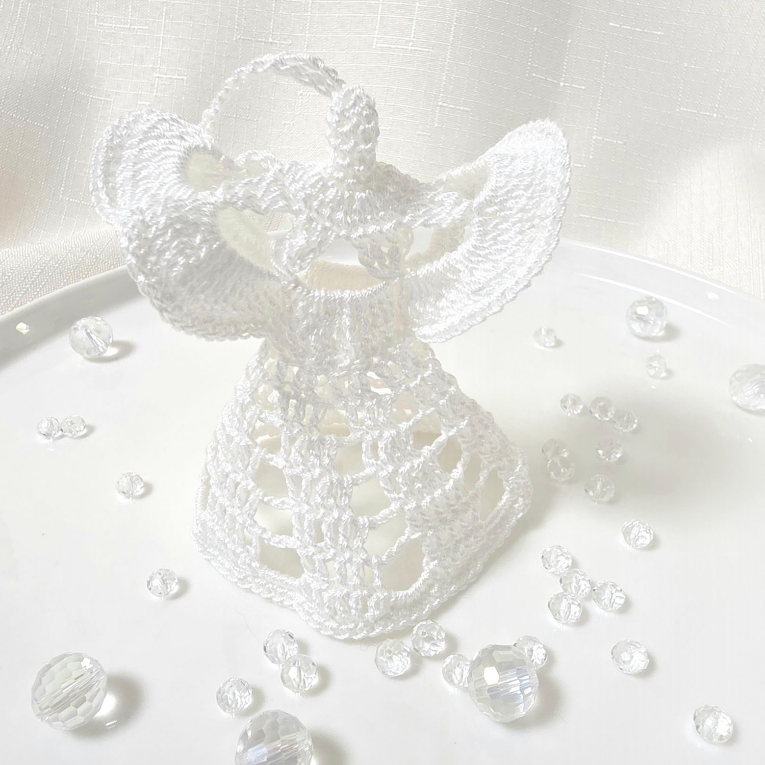 Kiekvienas angeliukas kruopščiai nunertas iš baltų medvilninių siūlų, todėl yra lengvas, švelnus ir spindintis.