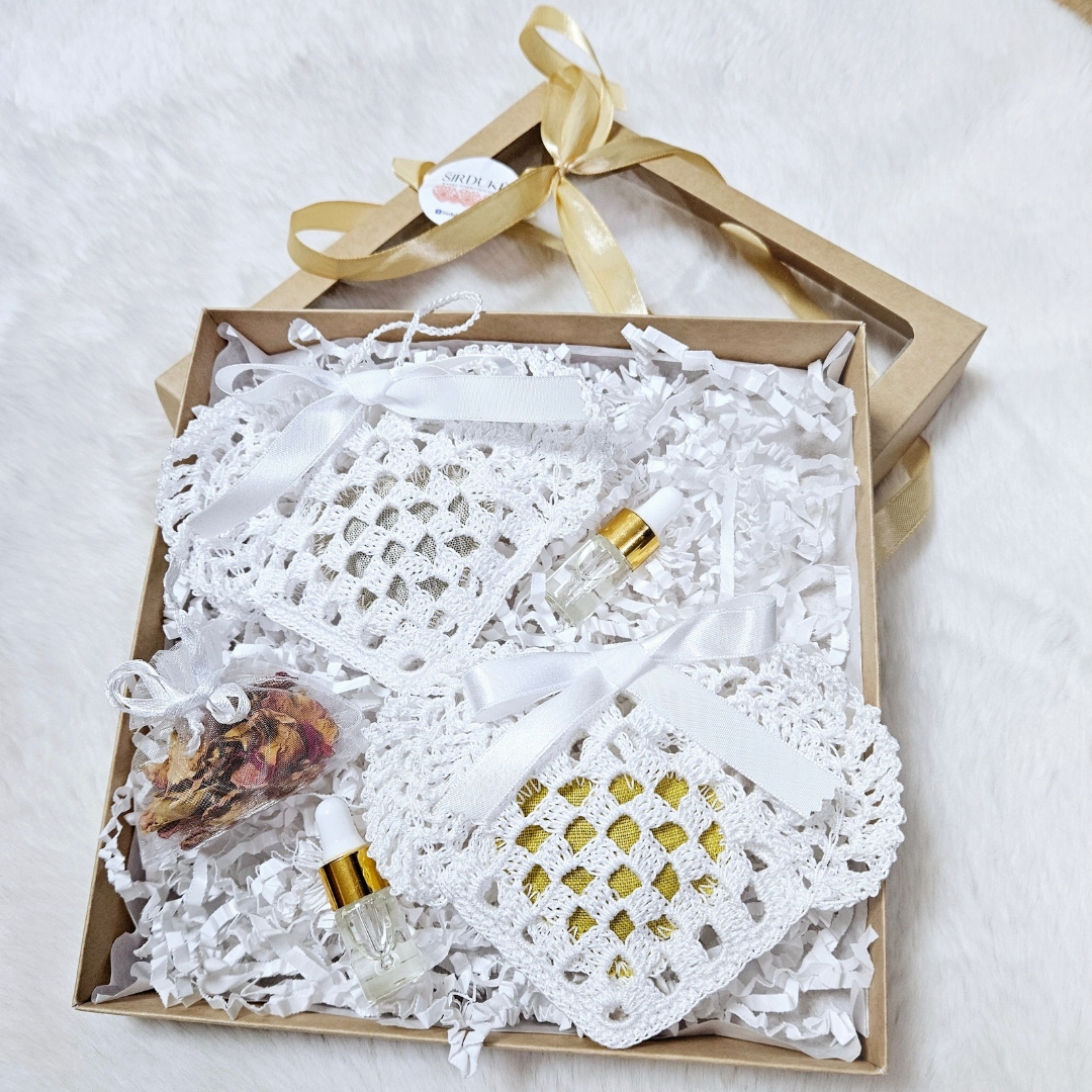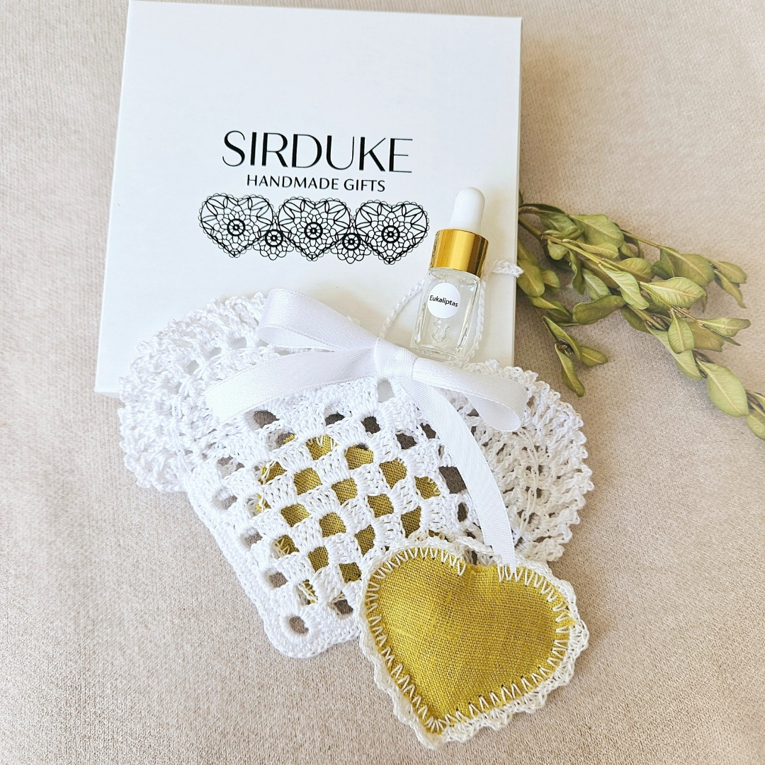 Pagalvėlė supakuota į rankų darbo vintažinį nertą maišelį, kuris tampa ir stilingu dekoro akcentu.