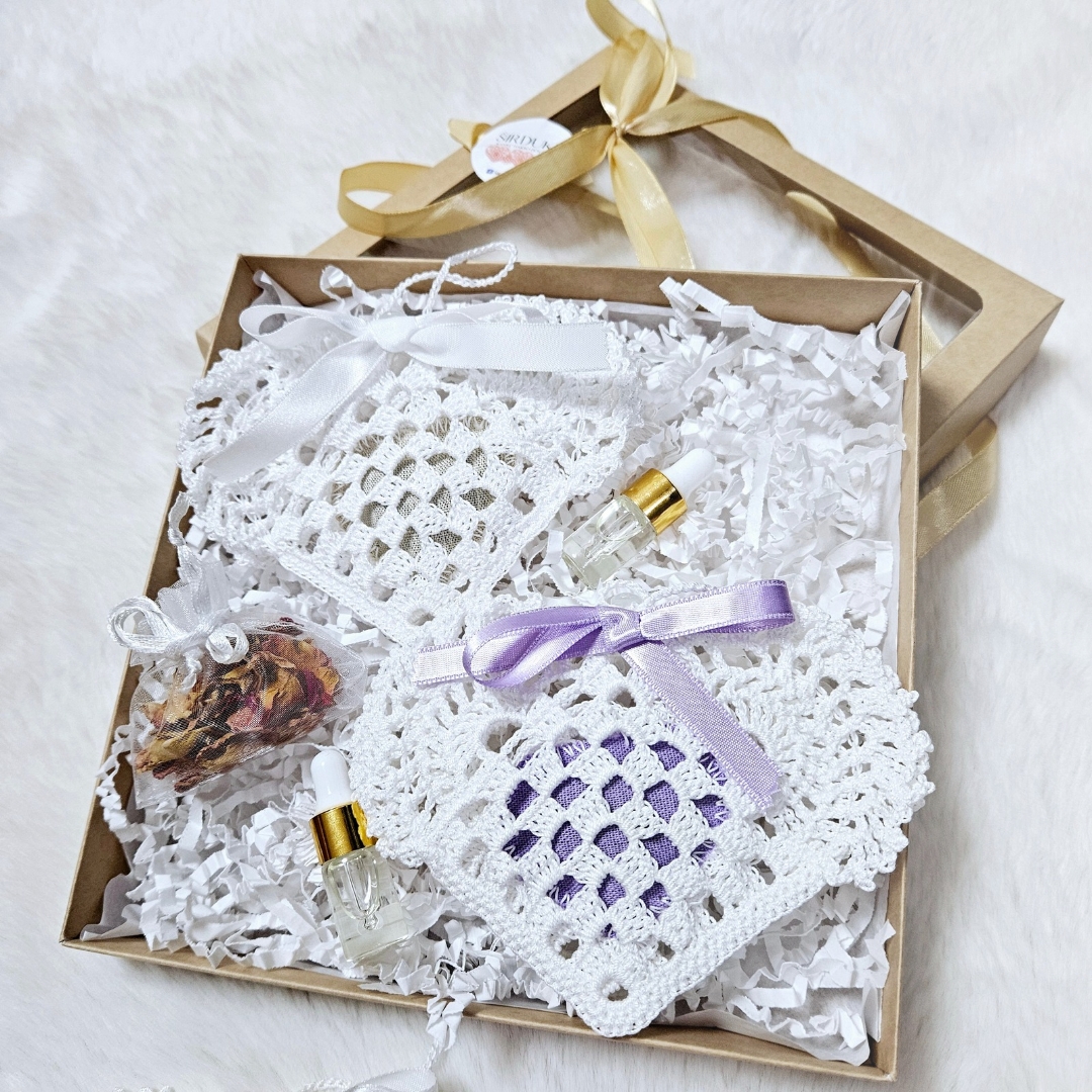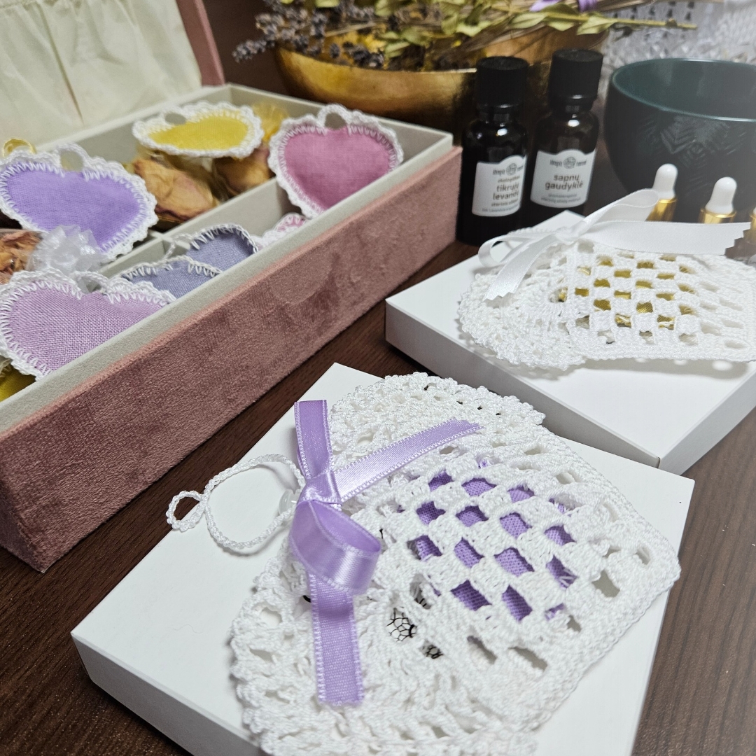 Kiekviena pagalvėlė supakuota į rankų darbo vintažinį nertą maišelį, kuris ne tik saugo kvapą, bet ir tampa stilinga dekoro detale – gali būti kabinamas spintoje, dovanų dėžutėje, automobilyje ar tiesiog padėtas ant naktinio stalelio.