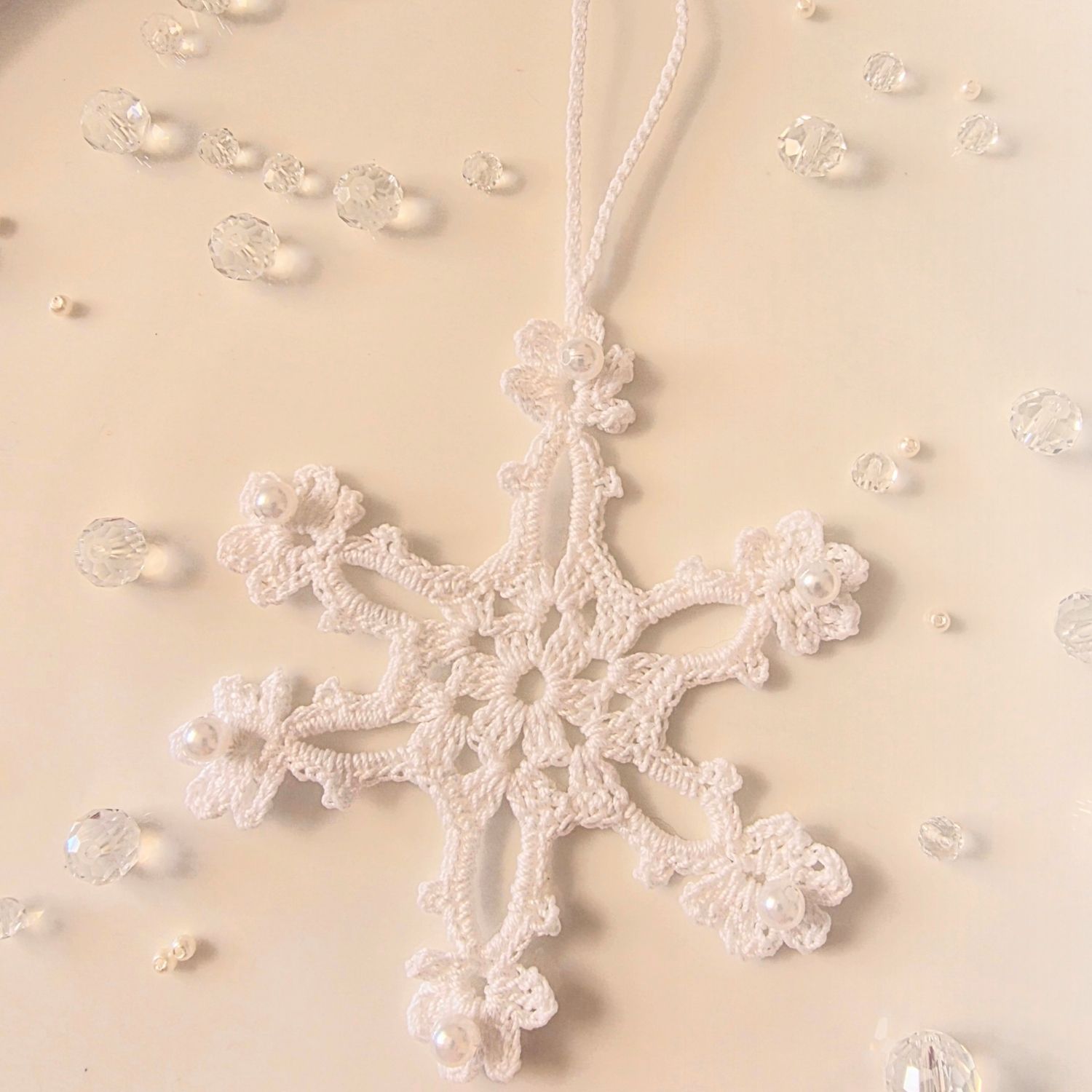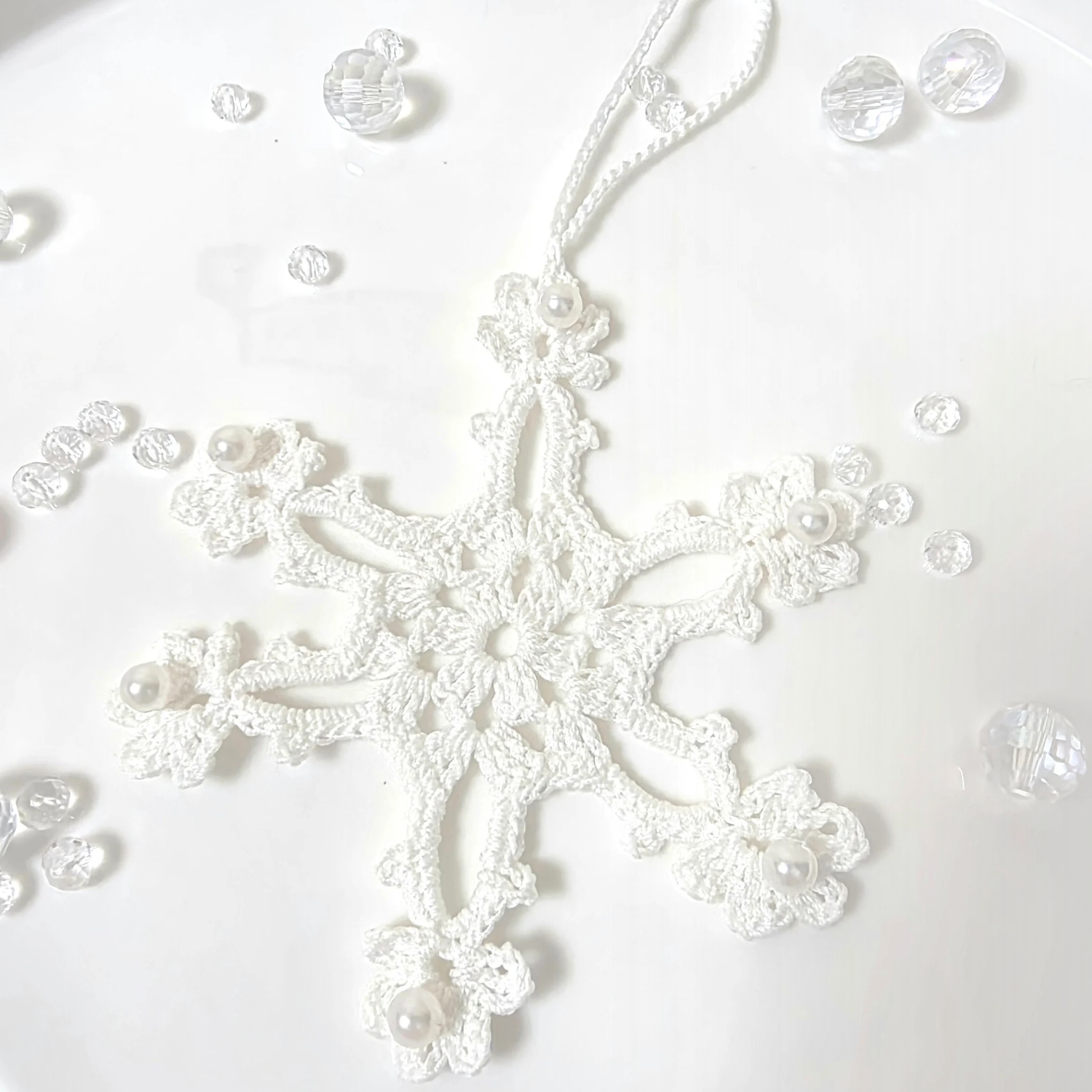 Kiekviena snaigė kruopščiai nunerta iš baltų medvilninių siūlų, dekoruota mažais burbuliukais, primenančiais ant lango sustingusius šalčio lašelius.