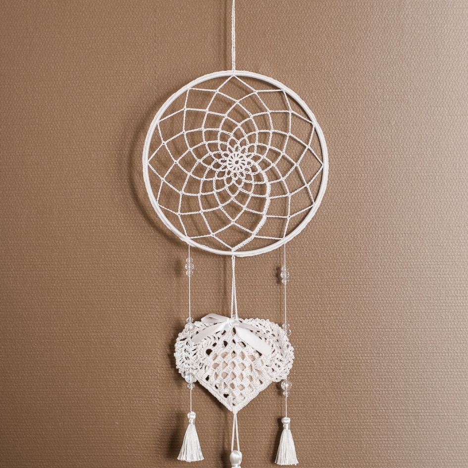 Kiekviena sapnų gaudyklė nunerta rankomis, derinant švelnius atspalvius, kokybiškus siūlus ir natūralias medžiagas.