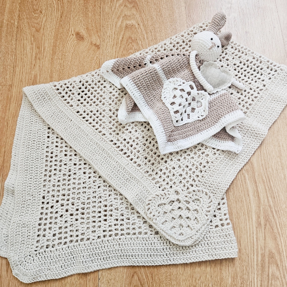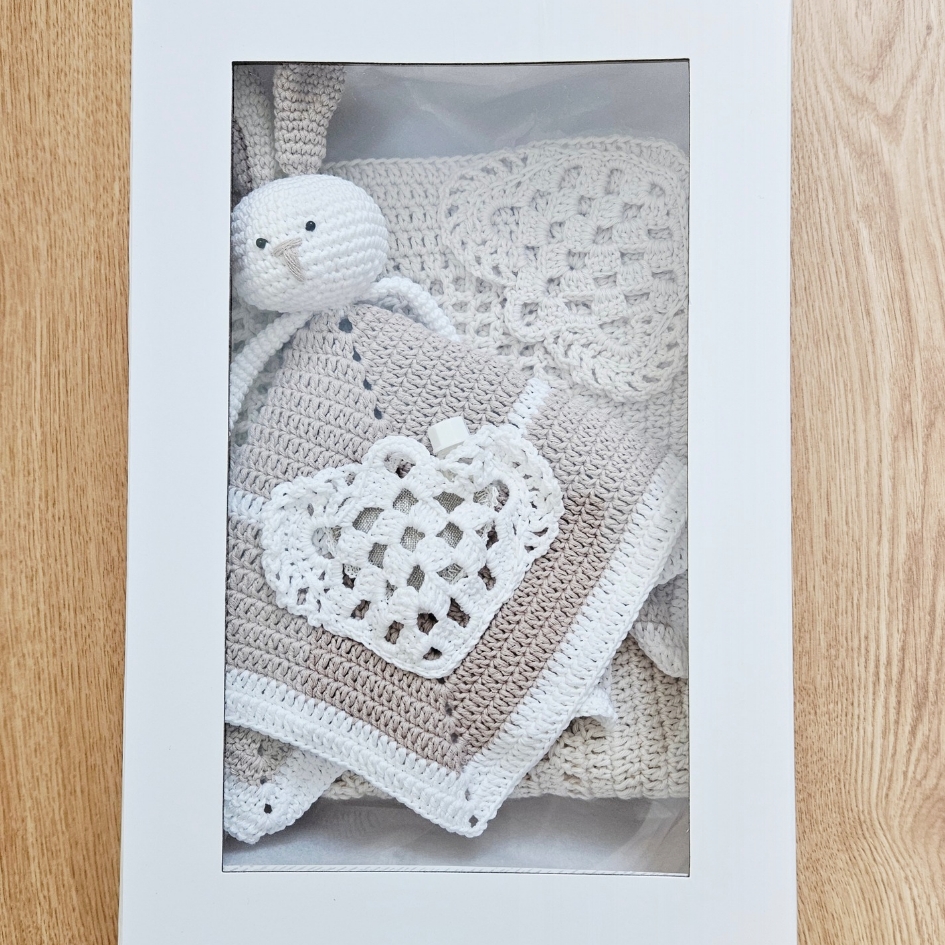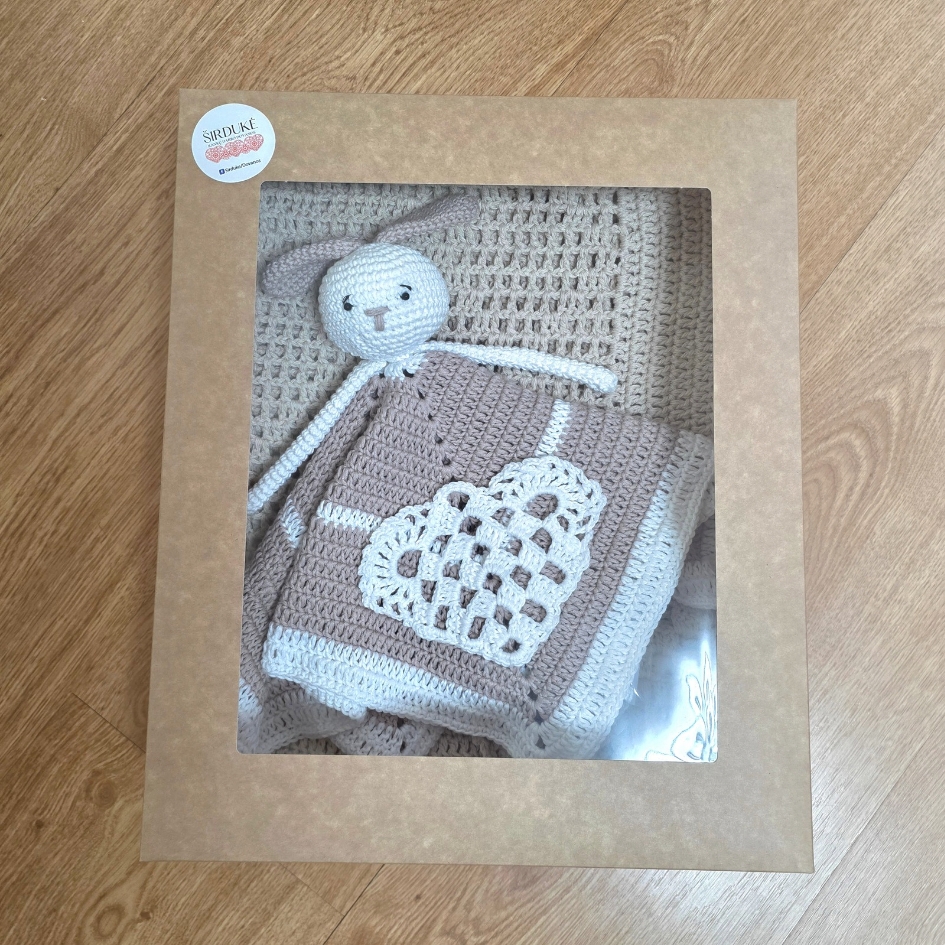 Smėlio spalvos rinkinys – Migdukas su pledu ir širdies formos kišenėle – tai švelnumo, natūralumo ir meilės kupinas rankų darbo kūrinys mažyliui.