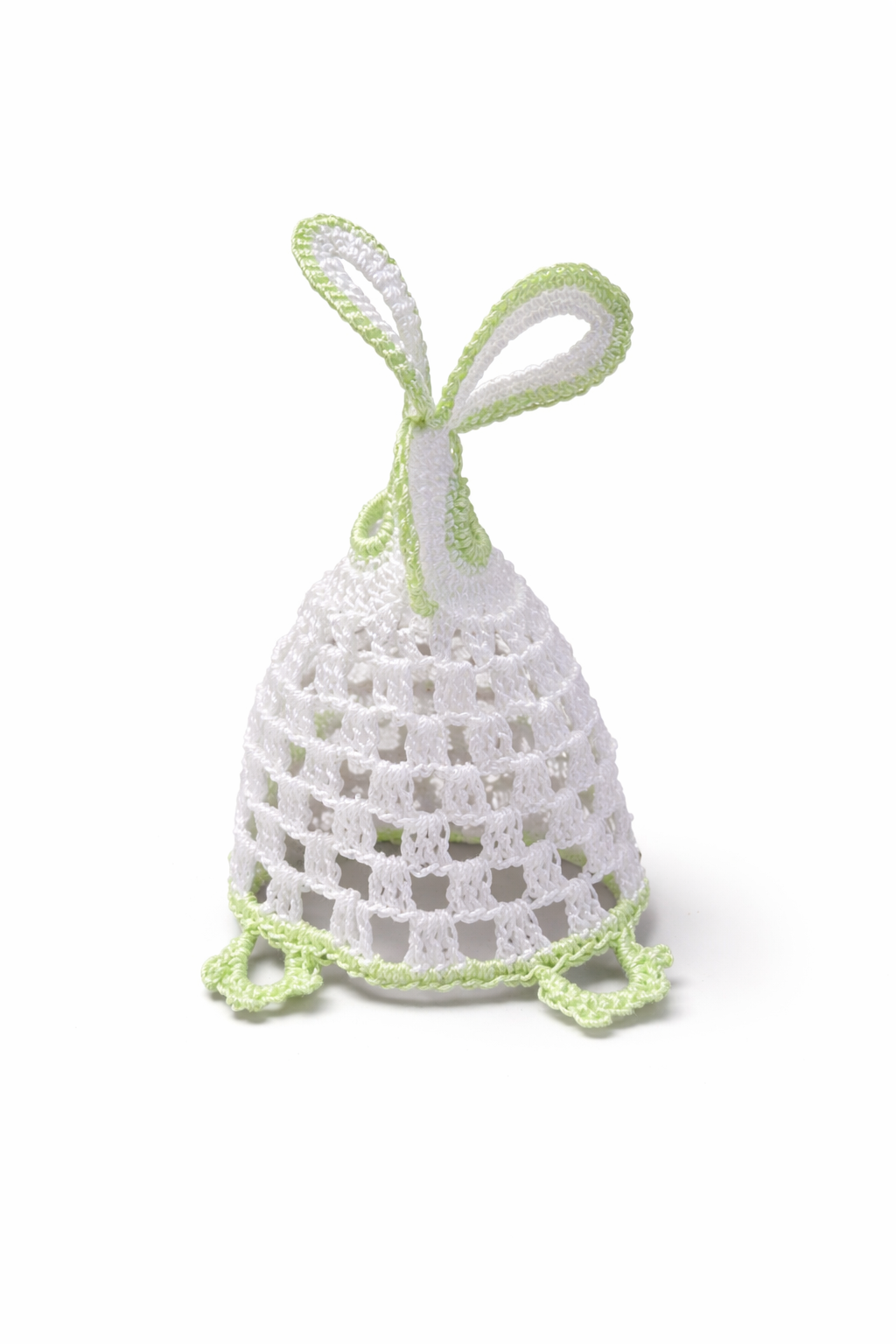 Rinkinį sudaro dekoratyvinė nerta servetėlė, servetėlių laikiklis „Kiškio ausytės“ ir du dekoratyviniai kiškučiai, po kuriais galima paslėpti margučius.